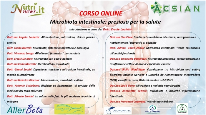 Dott.ssa Angela Lauletta: Alimentazione, microbiota, dolore pelvico cronicoDott. Guido Borrelli: Microbiota, sistema immunitario e oncologiaDott. Vincenzo Longo: Gli alimenti fermentati per la saluteDott. Ercole De Masi: Microbiota, ieri oggi e domaniDott.ssa Carla Marzetti: Metaboliti del microbiotaDott. Gianni Zocchi: Digestione, tossicità e microbiota intestinale, un mondo di interferenzeDott.ssa Federica Giacosa: Alimentazione, microbiota e dietaDott. Antonio Scalabrino: Biofisica ed Epigenetica al servizio della medicina del terzo millennioDott. Alberto Santini: La salute nelle feci: le più moderne tecniche di indagine